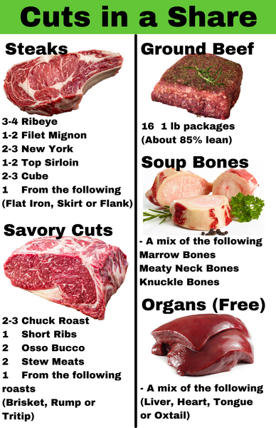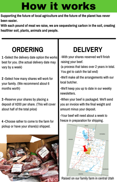 Were making this as easy as possible to get the right amount of meat for your family. So instead of selling 1/4's 1/2's and Wholes, we've split the cow 8 ways and called them shares. Now you can order the number of shares that makes since for your family. For example 3 shares should last about 6 months for a family of 6.